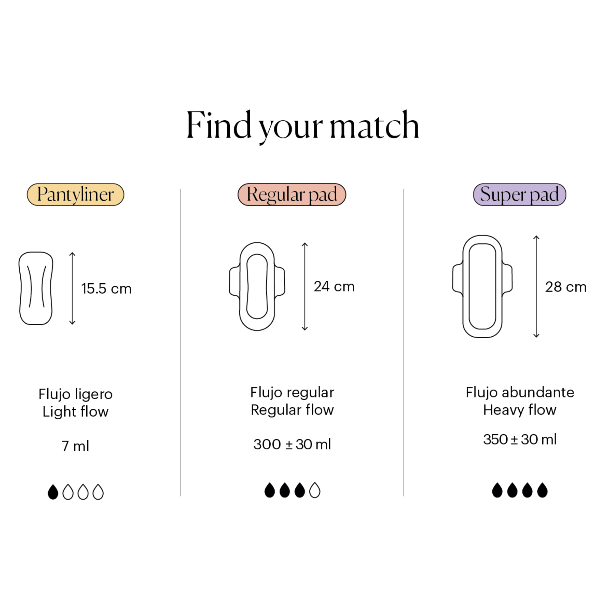 Flujo Regular: Nuestras toallas de flujo regular cuentan con una absorción de hasta 330 ml, miden 24 cms y son ideales para tus días del periodo con flujo regular.