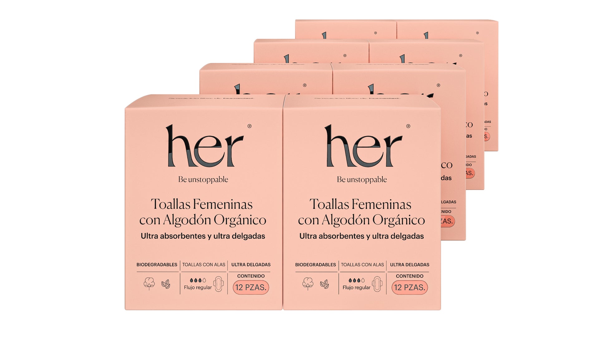 Kit de 8 cajas de toallas femeninas Flujo Regular con alas.